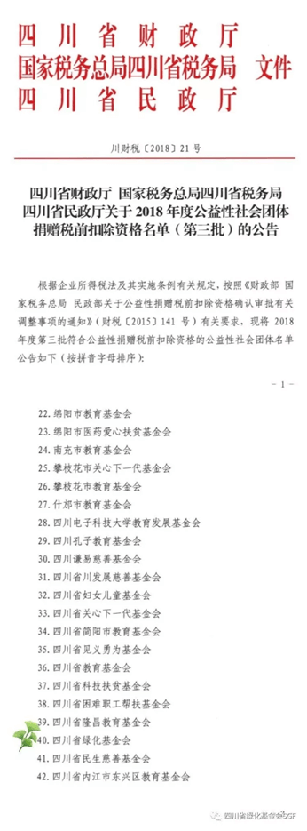 2018年11月19日,四川省财政厅、国家税务总局四川省税务局、四川省民政厅联合发布了关于2018年度公益性社会团体捐赠税前扣除资格名单(第三批)的公告......